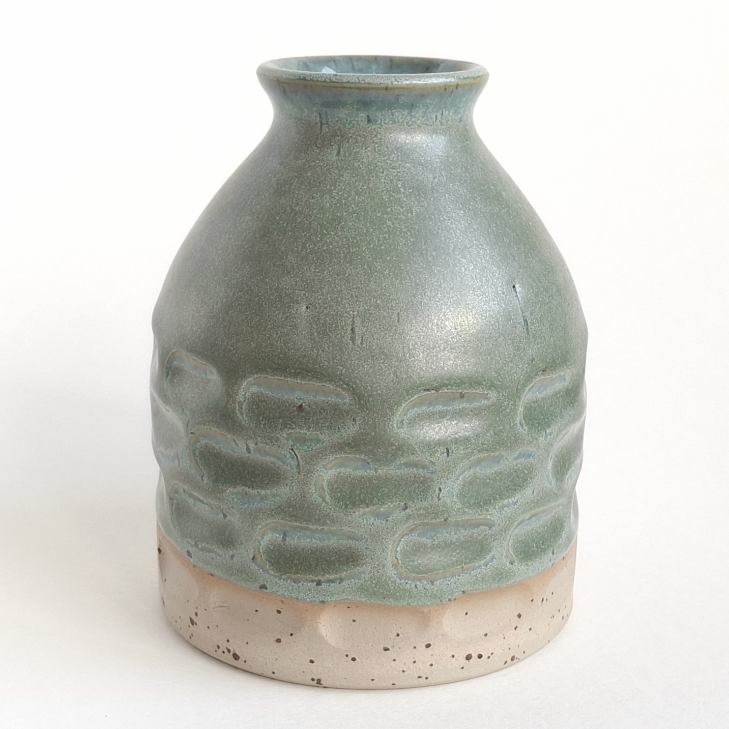 De unieke vaasjes uit de Terra Verde-serie zijn met de hand gedraaid en met zorg bewerkt. Ze zijn gemaakt van spikkelklei en deels afgewerkt met een matgroen glazuur, wat een natuurlijke en aardse uitstraling geeft.