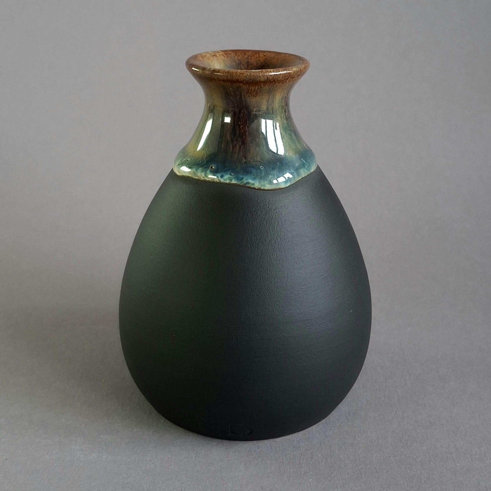 De vaasjes uit de Midnight Rain-serie spelen met contrast: een donkere, matte body en een glanzend glazuur dat doet denken aan een nachtelijke regenbui. Elk stuk is met de hand gedraaid en uniek in vorm en kleurnuance.