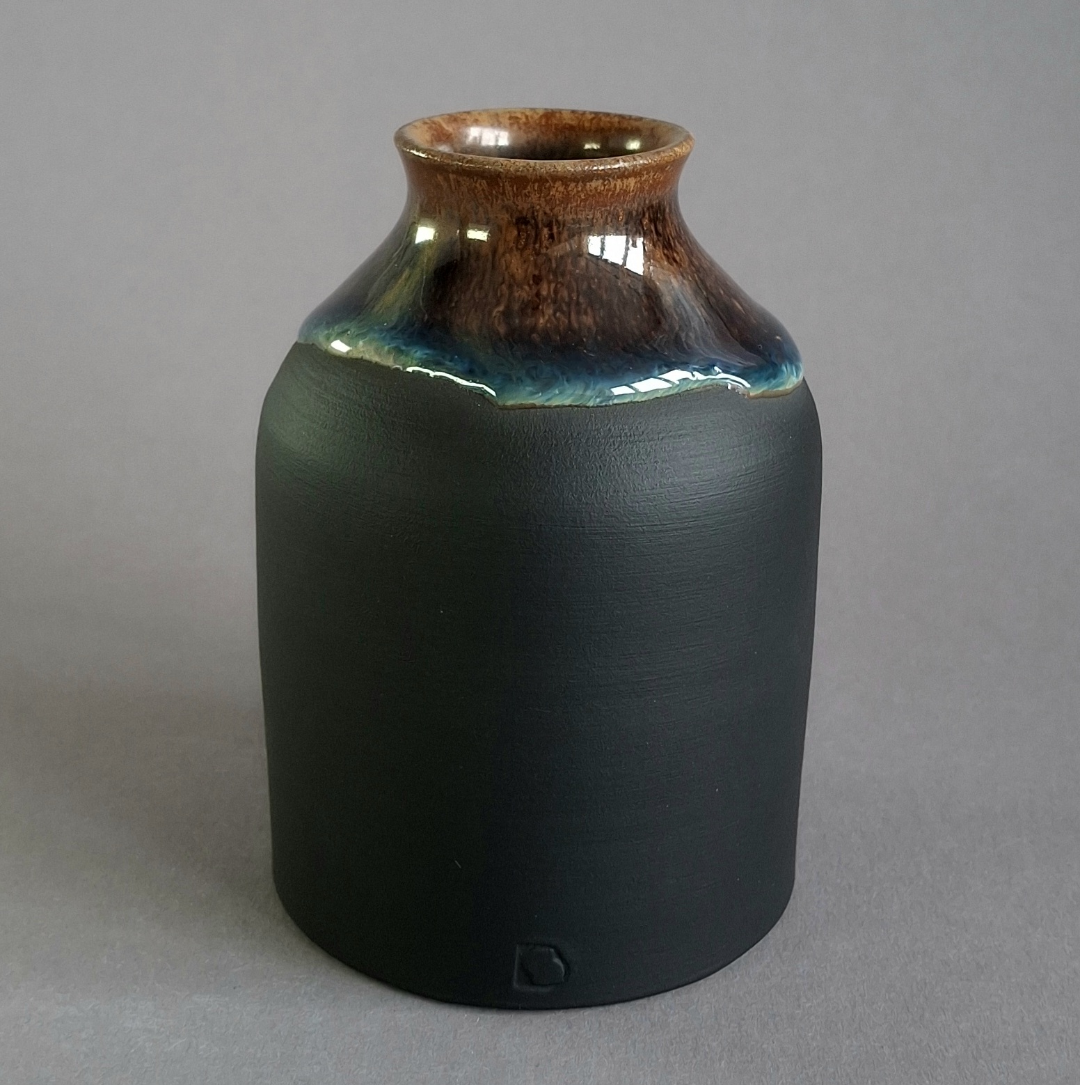 De vaasjes uit de Midnight Rain-serie spelen met contrast: een donkere, matte body en een glanzend glazuur dat doet denken aan een nachtelijke regenbui. Elk stuk is met de hand gedraaid en uniek in vorm en kleurnuance.
