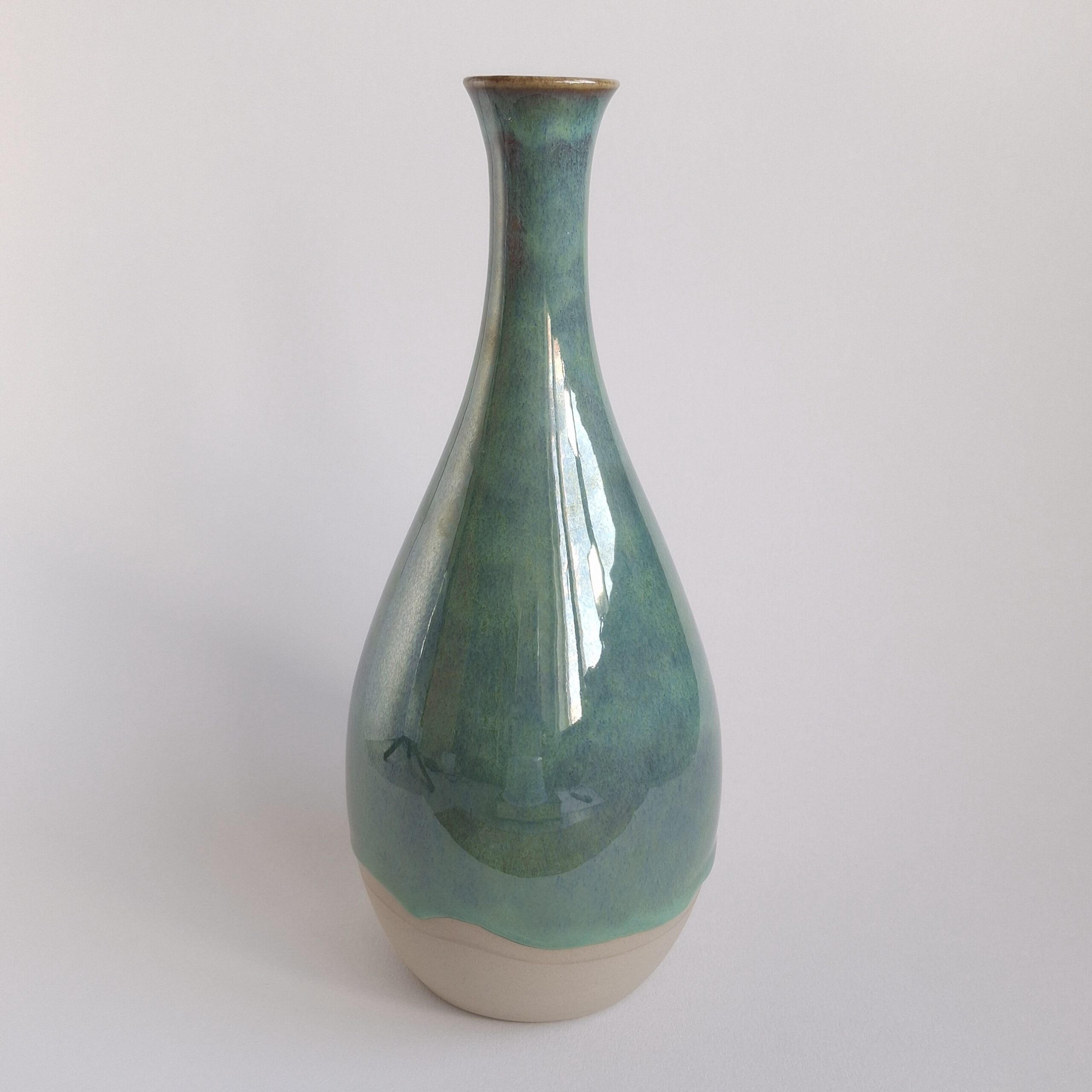 Deze vaas is met de hand gedraaid uit beige steengoedklei en is afgewerkt met een glanzend groen glazuur, waarbij de natuurlijke kleikleur deels zichtbaar blijft. Het slanke model met smalle hals maakt de vaas ideaal voor bijvoorbeeld één enkele bloem of een subtiel bosje droogbloemen. Dit geeft de vaas een elegante, verfijnde uitstraling. Ook mooi als blikvanger zonder bloemen.